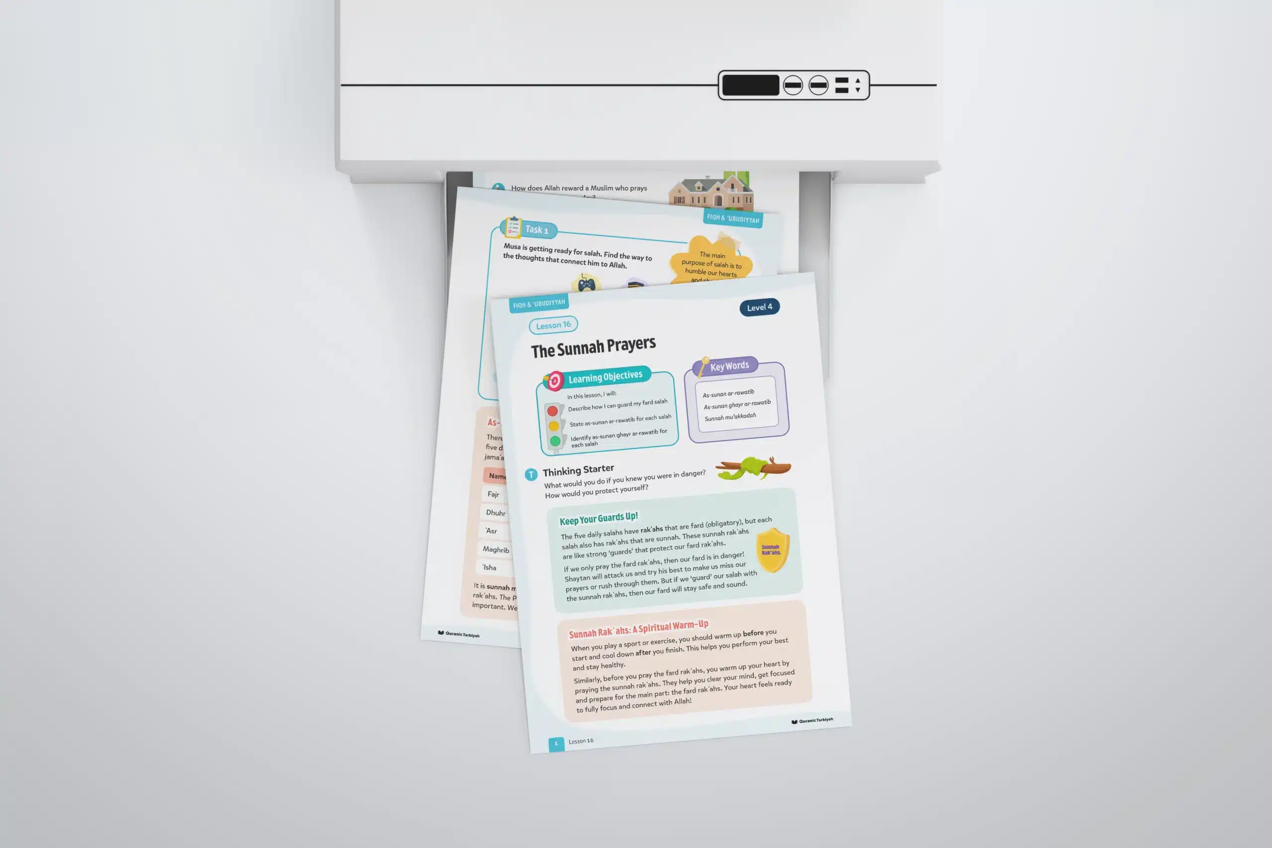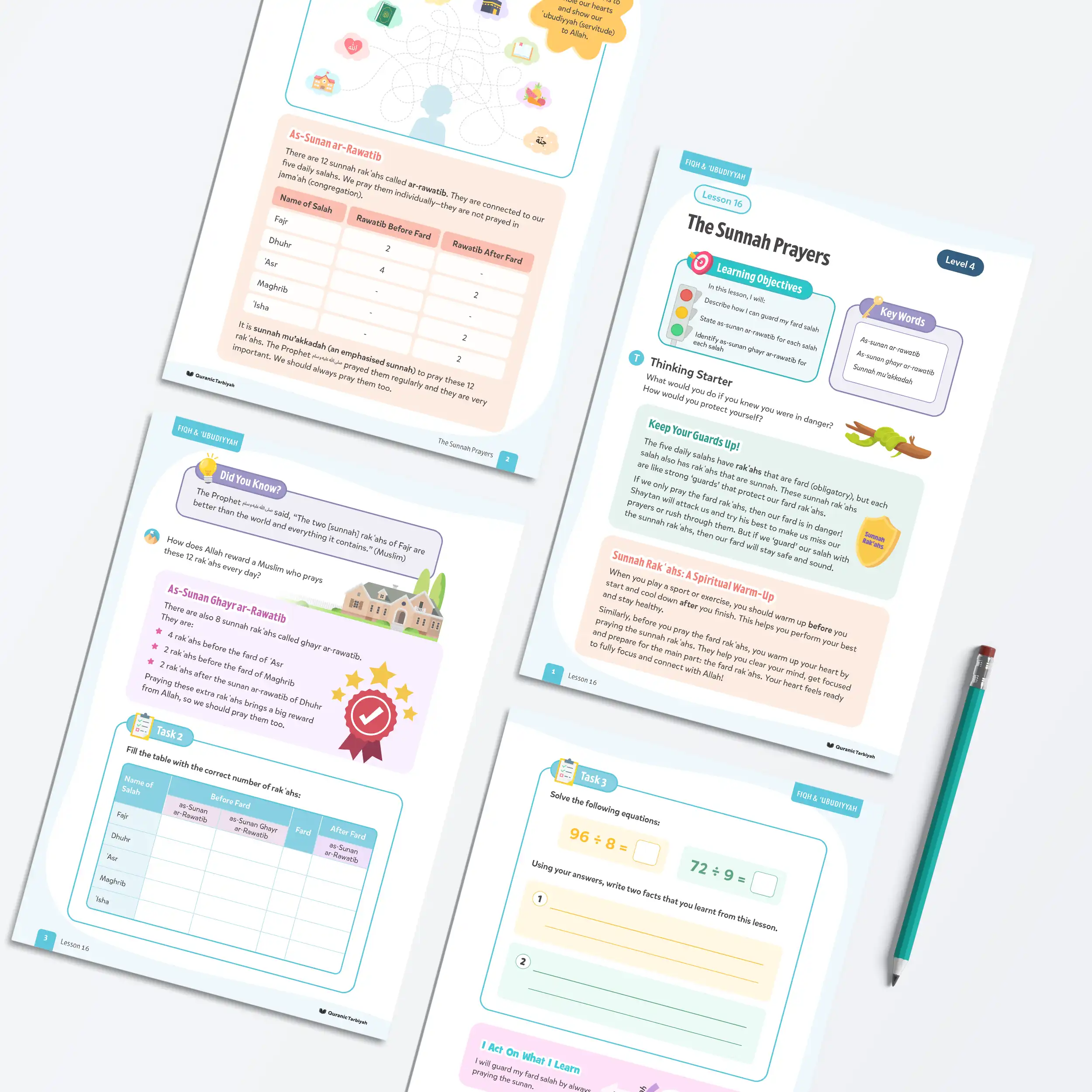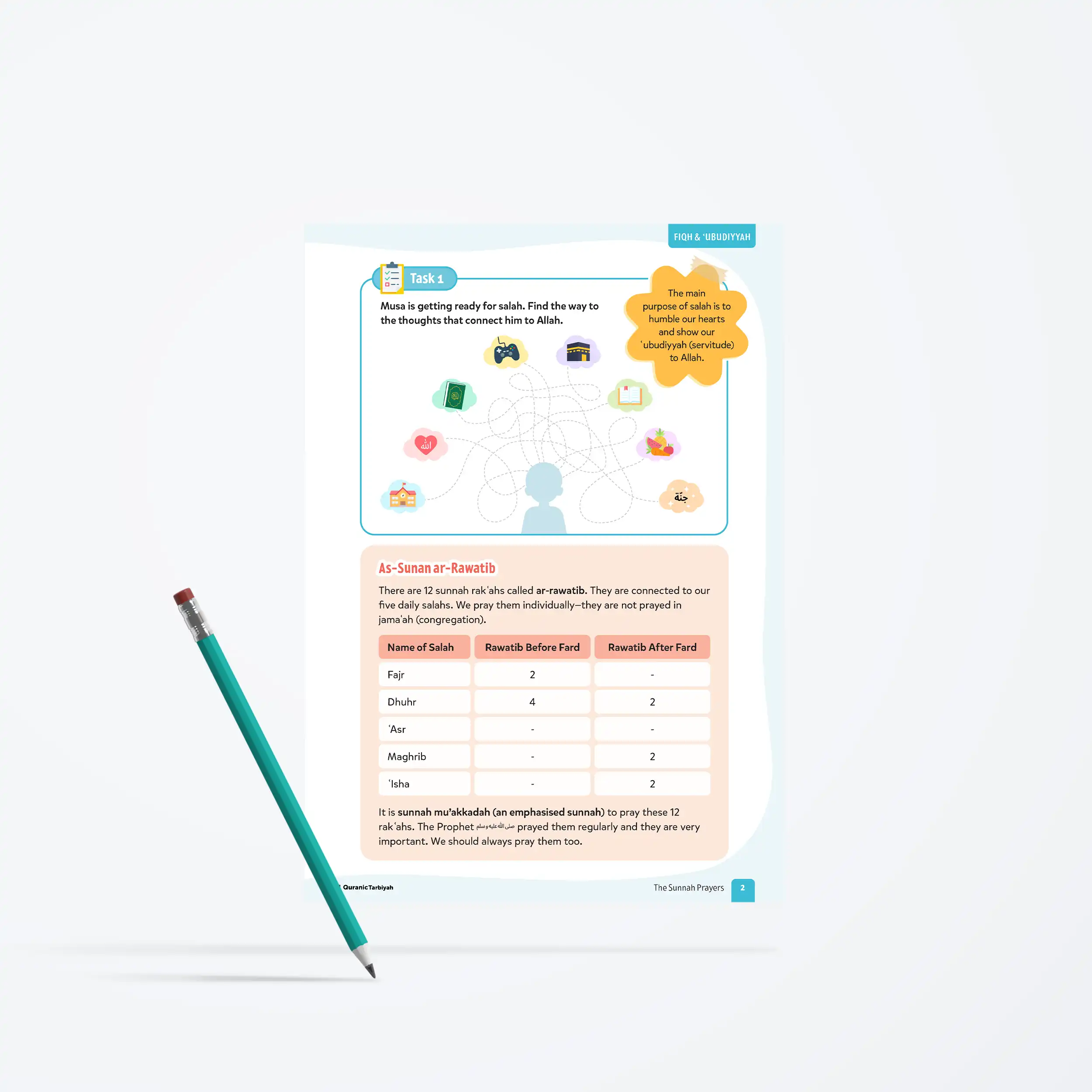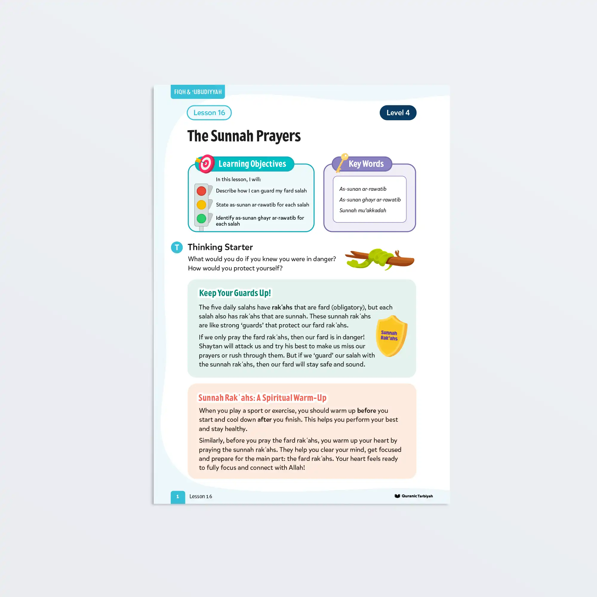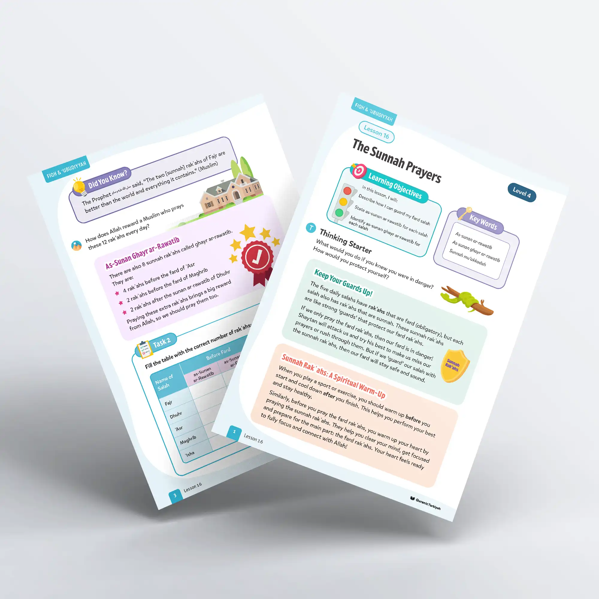 This thoughtfully designed lesson helps young learners understand that if we only pray fard rakʿahs, our fard is in danger from Shaytan who will attack and try to make us miss prayers or rush through them. Through reflection and practical activities, learners discover how sunnah rakʿahs help clear the mind, get focused, and prepare the heart to fully connect with Allah, understanding that the main purpose of salah is to humble our hearts and show our ʿubudiyyah (servitude).